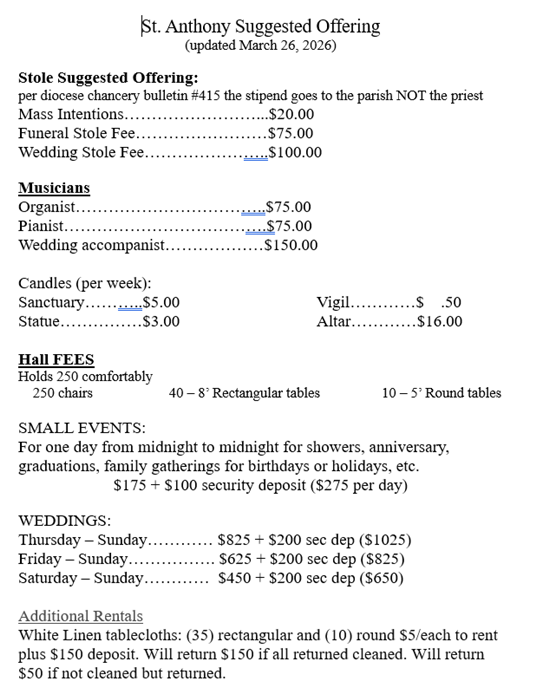 Wed. 5 pm and Sunday 8:30am @ St. Anthony (at 8:30am on Wednesday starting 4/1/26)